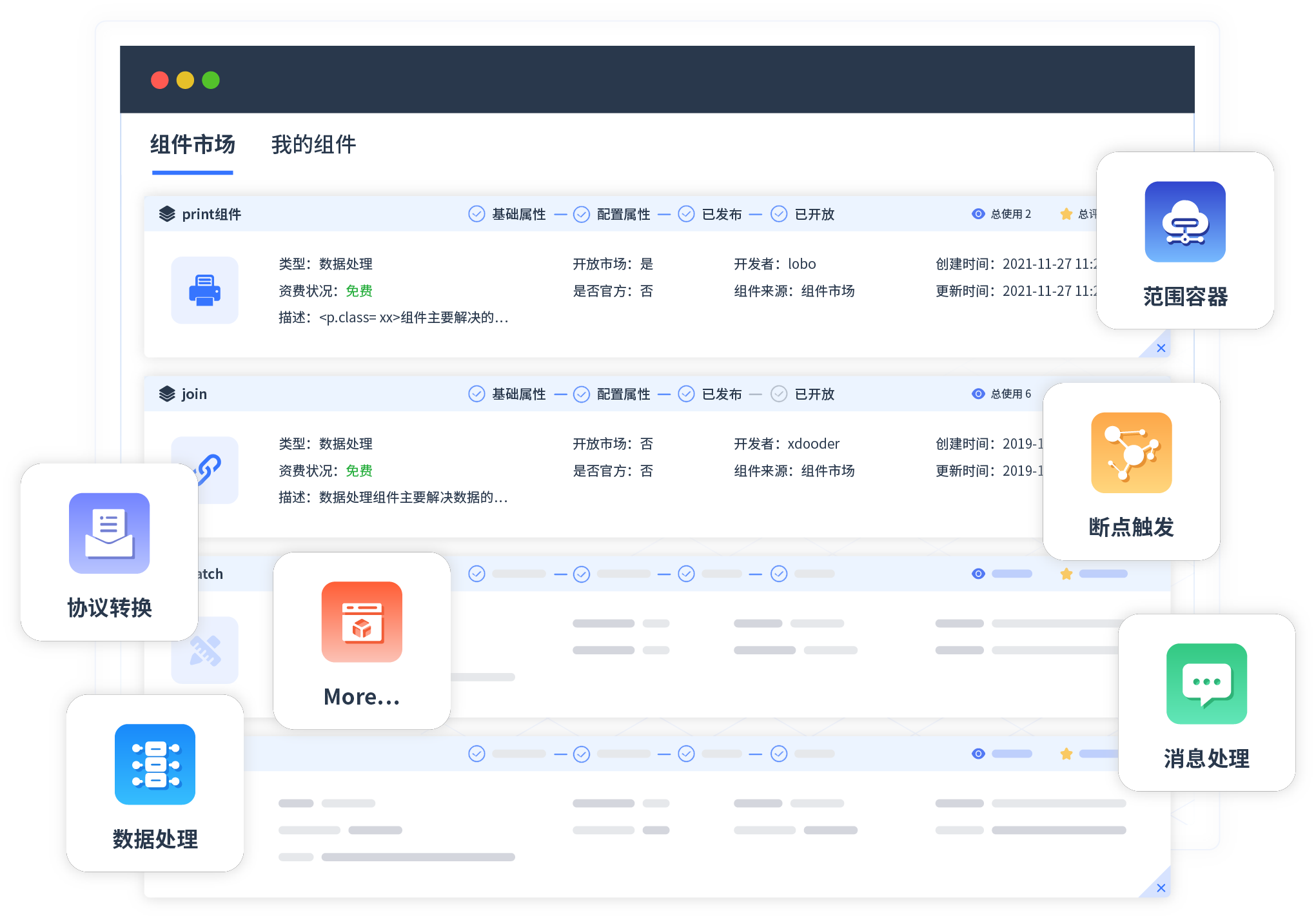 针对集成场景,南宫28相信品牌的力量链接提供组件市场,例如协议转换、消息处理、文件操作等。除平台提供的组件外,客户可以自定义所需组件。